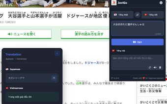 JaviGo is a free Chrome extension designed to enhance communication for users needing Japanese to Vietnamese translations. This tool offers a range of features, including manual translation where users can type or paste Japanese text for quick and accurate Vietnamese translations. Additionally, it allows users to highlight any Japanese text on web pages to receive immediate translations, making it a convenient resource for browsing.